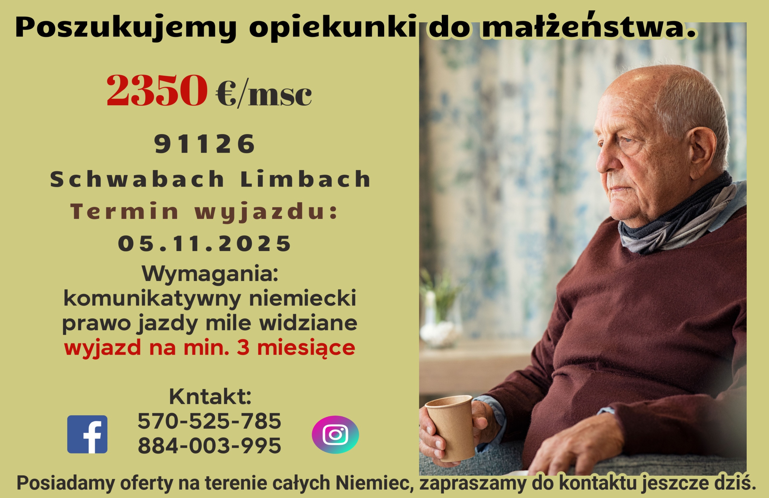 Poszukujemy opiekunki/opiekuna do miłego małżeństwa. 2400 EUR SCHWESTER PFLEGE1 SPÓŁKA Z OGRANICZONĄ ODPOWIEDZIALNOŚCIĄ |